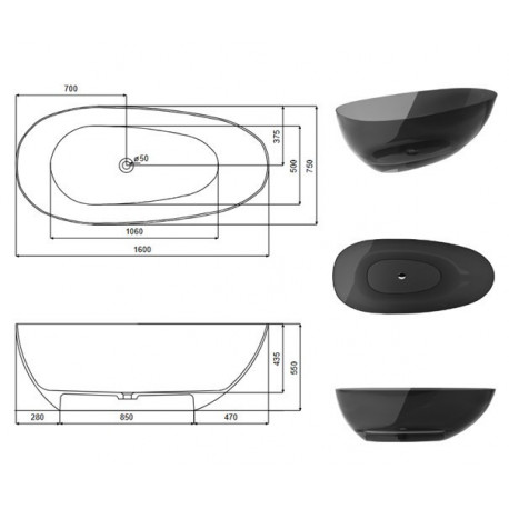 Besco > Vany > Volně stojící vany > Assos > Vana volně stojící Besco Xara 160x75 cm oválný Carbon Grey, maskownica černá matt