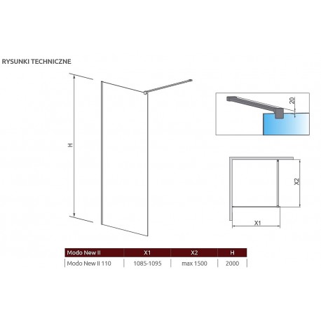Radaway > Sprchové boxy > Volně stojící zástěny > Modo New > Stěna Walk-In Radaway Modo New II 110, 108.5-109.5x200cm, GunMetal, sklo čiré